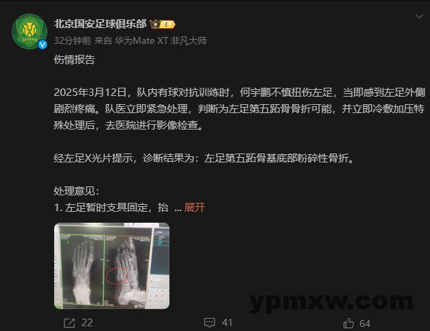 3月12日,国安队训练中传出坏消息,何宇鹏在对抗中扭伤左脚。国安社媒官宣,经过医院检查,诊断为左足第五跖骨基底部粉碎性骨折。球队马上安排他去积水潭医院找专家,明天就要动手术了。