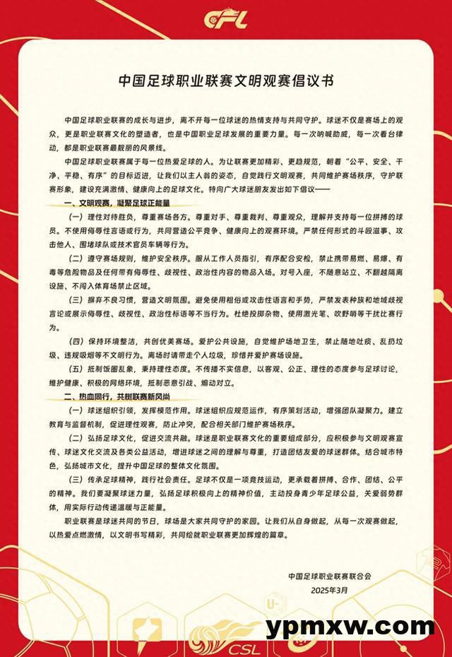 中国足球职业联赛属于每一位热爱足球的人,为让联赛更加精彩、更趋规范,特向广大球迷朋友发出倡议。 文明观赛,凝聚足球正能量;热血同行,共树联赛新风尚。让我们从自身做起,从每一次观赛做起,共同打造“我的文明赛场”。 来源:中国足球协会职业联赛官方网站 KY体育新闻中心 KY体育·(中国)官方网站新闻中心 点球大战遭皇马淘汰!马竞后卫吉梅内斯:感谢队友,他们拼尽全力 中乙山东泰山B队主场年票开售:至尊年票99元,钻石年票199元