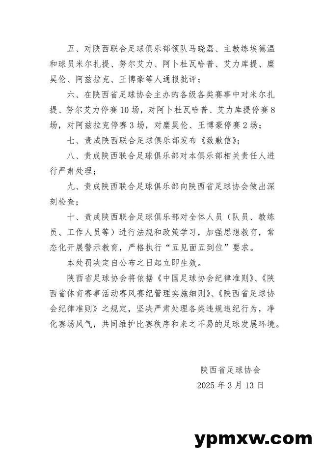 9、责成陕西联合足球俱乐部向陕西省足球协会做出深刻检查。