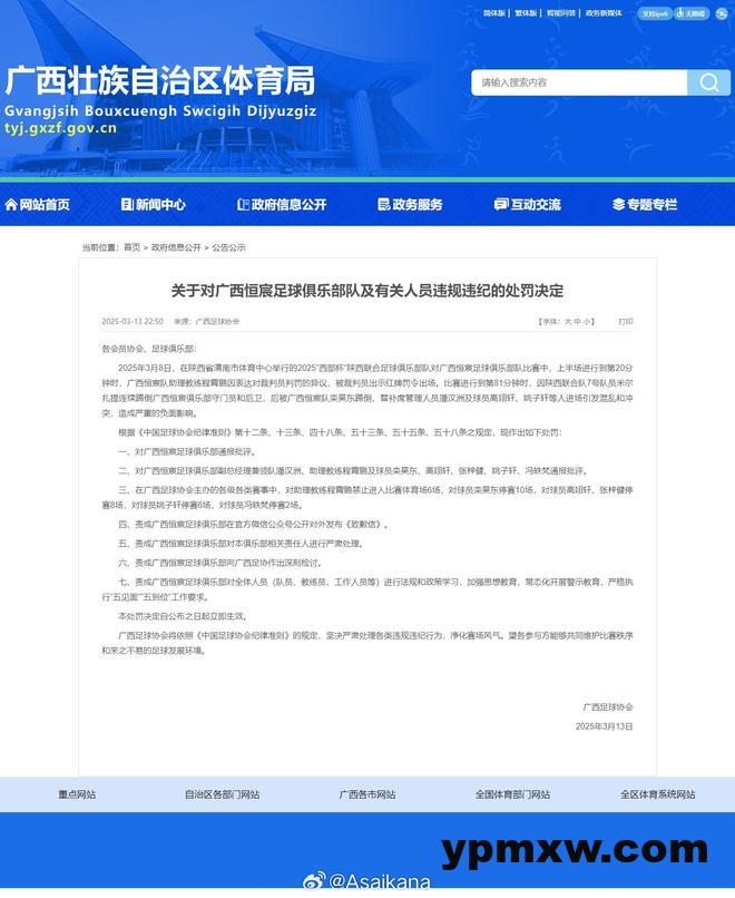 直播吧03月13日讯 陕西省体育局、广西壮族自治区体育局分别发布了两地足协《关于对陕西联合足球俱乐部及有关人员 违规违纪的处罚决定》《关于对广西恒宸足球俱乐部队及有关人员违规违纪的处罚决定》。