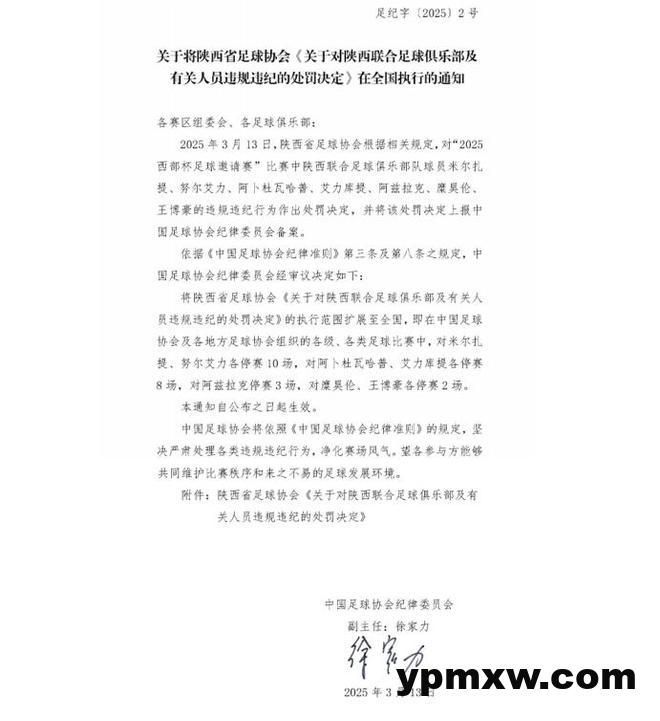 陕西联合:对米尔扎提、努尔艾力各停赛10场,对阿卜杜瓦哈普、艾力岸提各停赛8场,对阿兹拉克停赛3场,对糜吴伦、王博豪各停赛2场。