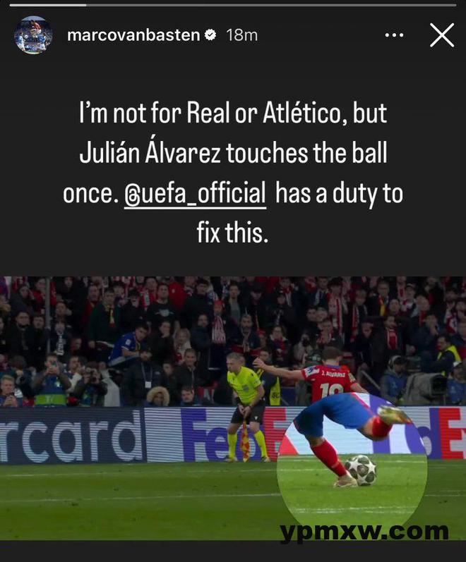 雷速体育3月14日讯 此前欧冠1/8决赛次回合,马竞点球大战不敌皇马出局。阿尔瓦雷斯点球被判罚二次触球无效。 荷兰名宿范巴斯滕在今天更新社媒,发表了自己的看法:“我不是皇马或马竞的球迷,但小蜘蛛只碰了一次球,欧足联有义务来解决这个问题。” KY体育新闻中心 KY体育·(中国)官方网站新闻中心 吉马良斯&伊萨克:利物浦是世界最佳 现在感觉很好非常期待比赛 皇家社会官方:裁判就是穿着蓝衣服的魔鬼