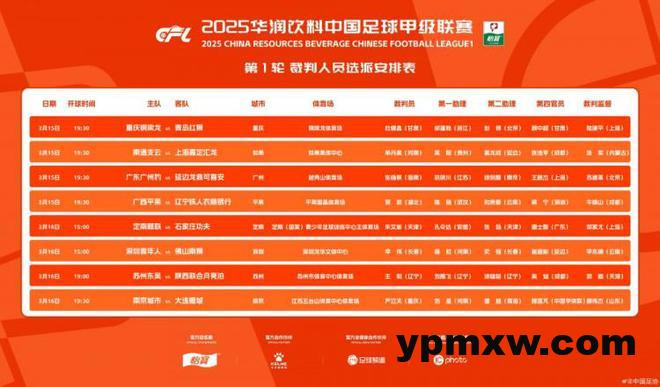 直播吧3月15日讯 中国足协公布中甲联赛首轮裁判组名单,张杨帆执法广东广州豹vs延边龙鼎,王阳执法苏州东吴vs陕西联合。