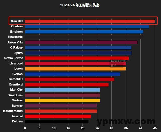 2022/23赛季,曼联累计伤病高达69次,和诺丁汉森林并列英超最多。