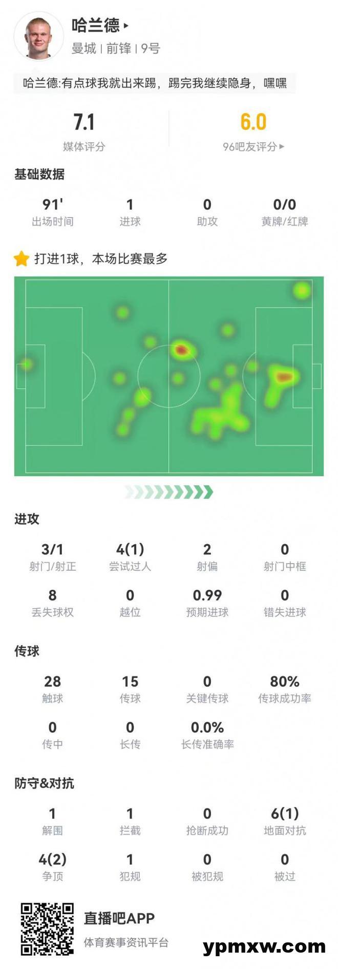直播吧3月16日讯 曼城在本轮英超2-2战平布莱顿哈兰德本场数据如下: