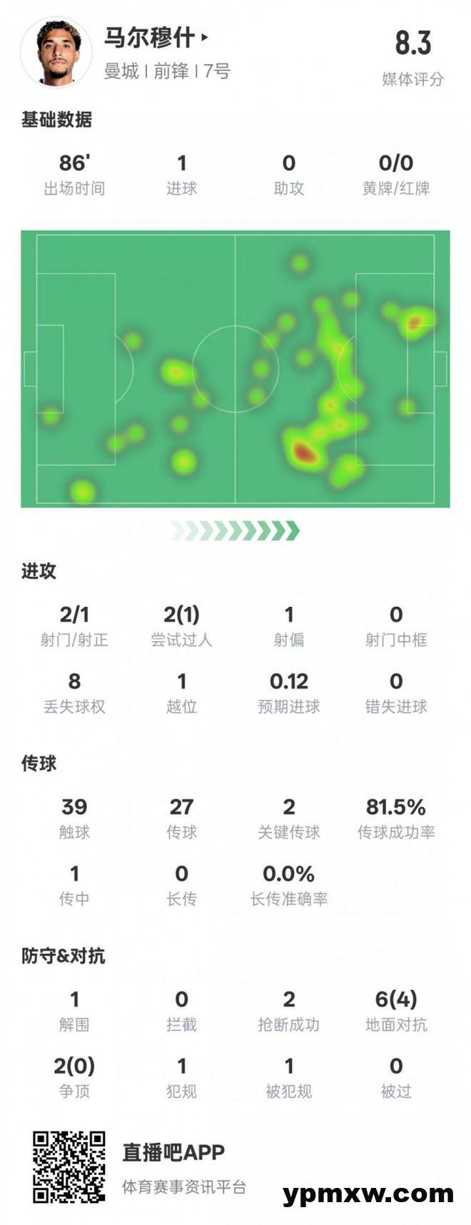 直播吧3月16日讯 英超第29轮,曼城主场对阵布莱顿,马尔穆什首发出战,制造1粒点球,打进1粒进球,送出2次关键传球,评分8.3。