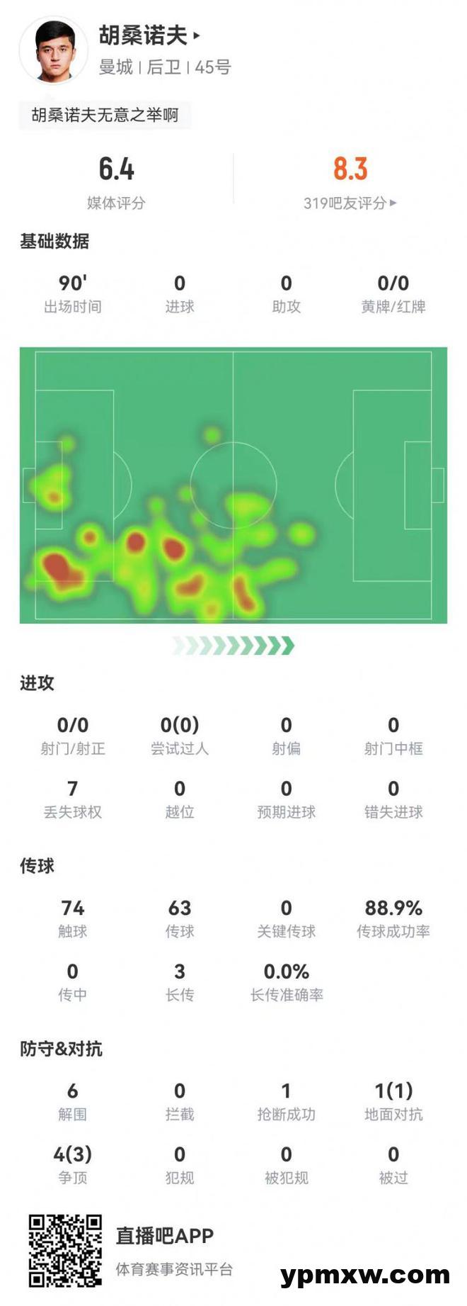 直播吧3月16日讯 曼城在本轮英超2-2战平布莱顿,胡桑诺夫本场数据如下: