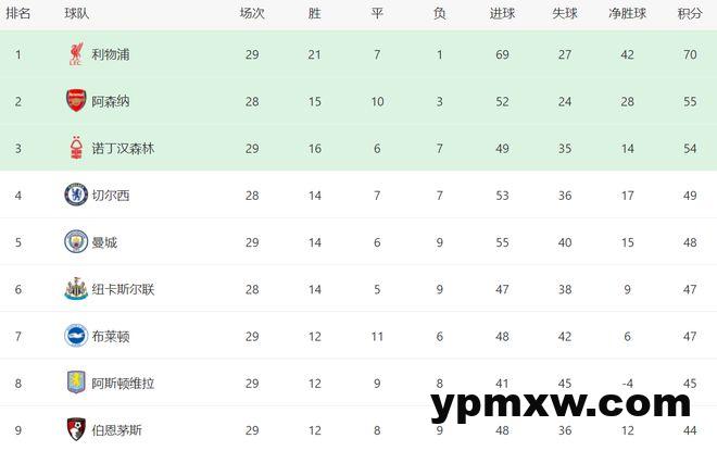 在积分榜上,利物浦70分领跑。阿森纳55分排名第2。诺丁汉森林54分,只比阿森纳少1分。切尔西49分排名第4。第5的曼城只有48分。纽卡斯尔联和布莱顿都是47分,继续施压曼城。阿斯顿维拉45分排名第8。