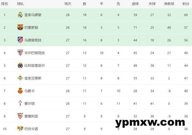 在积分榜上,18胜6平4负的皇马以60分高居榜首。巴萨拿到57分排名第2。虽然巴萨落后,但比皇马少踢2场比赛。马竞拿到56分排名第3。毕尔巴鄂竞技49分排名第4。比利亚雷亚尔44分排名第5。皇家贝蒂斯41分排名第6。