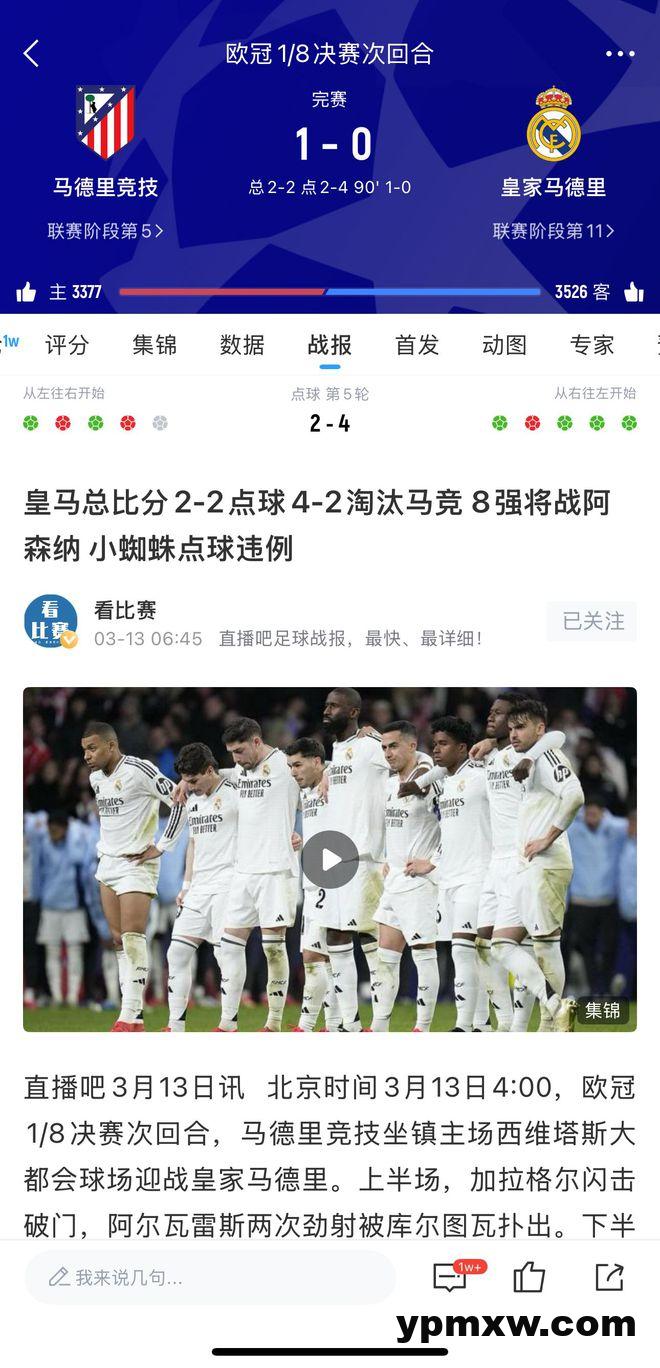 3月13日4:00,欧冠1/8决赛次回合,皇马客战马竞经历加时、点球大战,鏖战2小时45分钟