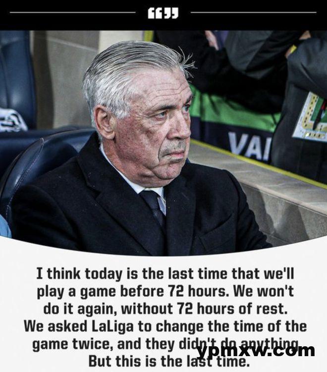 为此,主帅安切洛蒂在赛后接受采访时表示:“我认为今天是我们在休息时间少于72小时的情况下进行的最后一场比赛。我们永远不会再在休息时间少于72小时的情况下比赛。我们已经两次向西甲联赛请求更改比赛时间,但没有任何改变,而这是最后一次。”从话语中不难看出,他没有给自己留任何的台阶,态度相当之强硬。