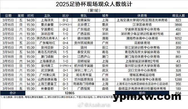 足协杯第1轮的比赛全部结束,现场观众人数方面,重庆春蕾主场3866人最多。本轮场均观众人数804人。