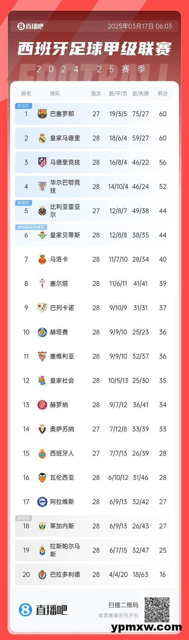 直播吧3月17日讯 西甲第28轮,巴萨让二追四4-2逆转马竞,取得联赛七连胜。 最新西甲积分榜↓ KY体育新闻中心 KY体育·(中国)官方网站新闻中心 巴萨4-2逆转马竞!重返西甲榜首 费兰替补双响 亚马尔世界波绝杀 剑南春|巴萨让二追四4-2马竞,亚马尔、莱万破门,费兰双响