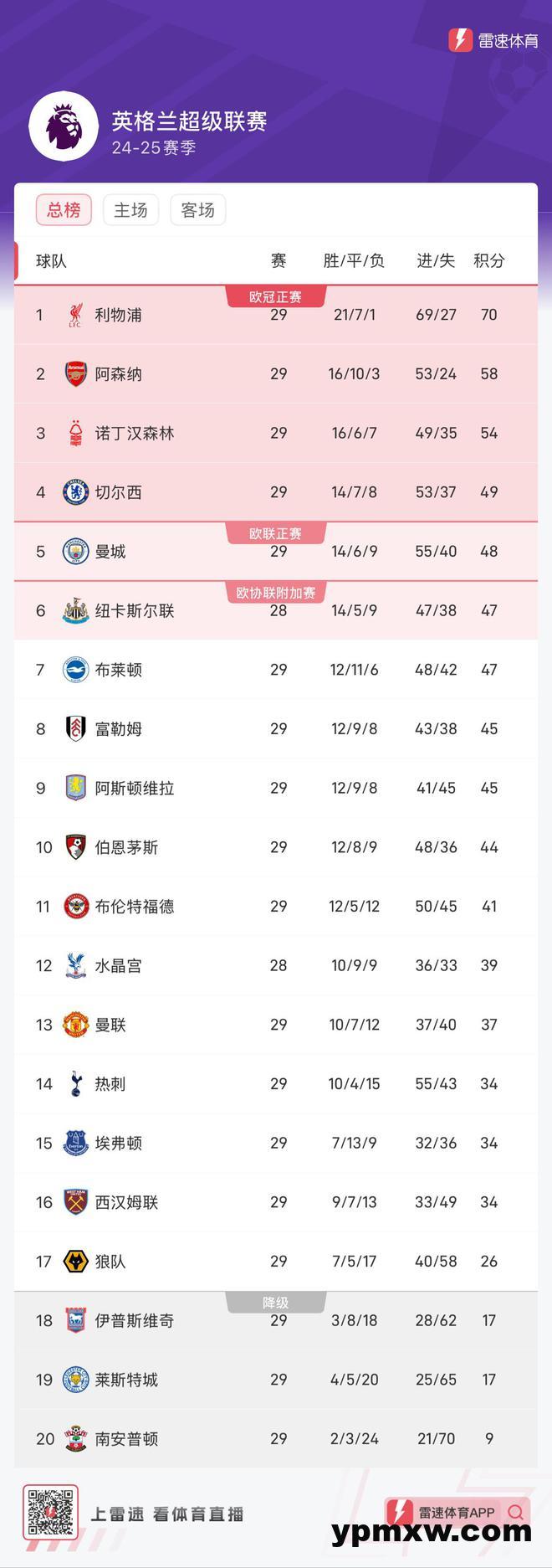 雷速体育3月17日讯 英超第29轮今天凌晨结束,曼联客场3-0完胜莱斯特城,伦敦德比中,阿森纳1-0小胜切尔西。 在最新积分榜中,利物浦积70分排在榜首,领先阿森纳12分,曼城第5,曼联第13。 英超最新积分榜: KY体育新闻中心 KY体育·(中国)官方网站新闻中心 体坛联播|巴萨让二追四逆转马竞,纽卡击败利物浦首夺联赛杯 什琴斯尼:我对胜利非常高兴,但也为马竞感到有点遗憾