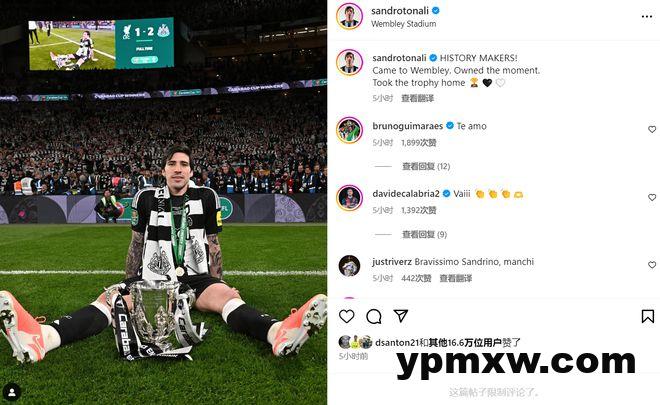 托纳利在赛后更新社媒,晒出了奖杯照:“纽卡创造了历史,在温布利球场,我们掌控这一时刻。”