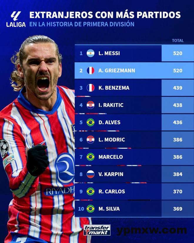据德国转会市场统计,此役过后,格列兹曼已出战520场西甲比赛,与梅西并列排名西甲历史外援出场榜首位。