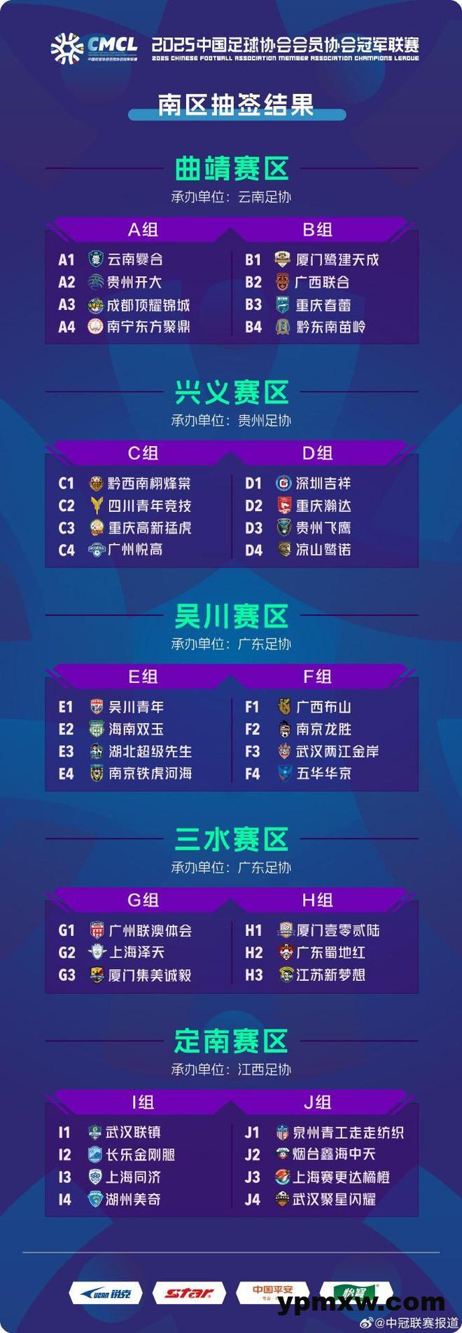 直播吧3月17日讯 2025赛季中冠联赛南区抽签结果出炉,本赛季中冠南区分5个赛区进行,每个赛区分2组,共计38支球队参赛。