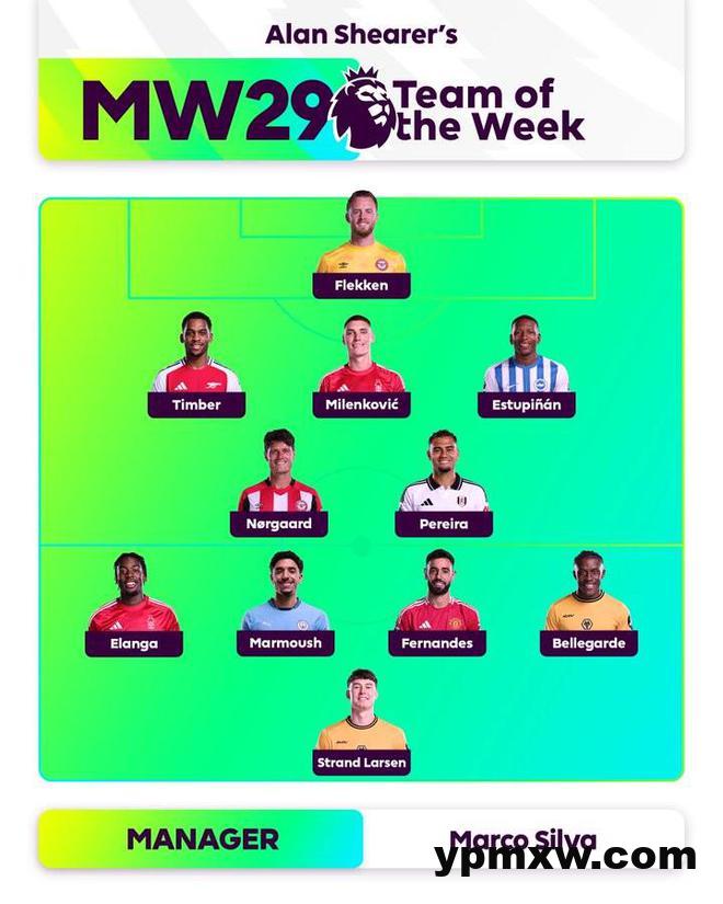 中场:内尔高(布伦特福德)、佩雷拉(富勒姆)、埃兰加(诺丁汉森林)、马尔穆什(曼城)、布鲁诺-费尔南德斯(曼联)、贝勒加德(狼队)