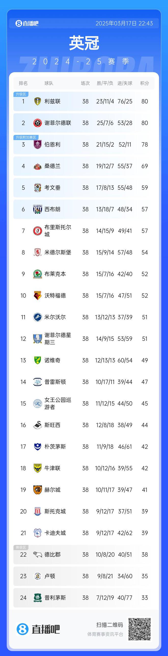 周末英冠结束第38轮的较量,榜首的利兹联战平女王公园巡游者,被身后的谢菲联积分追平,第3的伯恩利本轮也取得胜利,仅落后前两名2分。