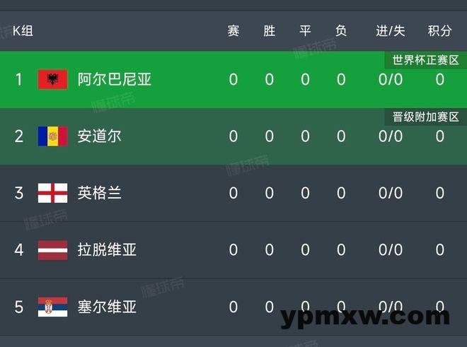 在2026年世界杯欧洲区预选赛里,英格兰与塞尔维亚、阿尔巴尼亚、拉脱维亚和安道尔一共5支球队组成了K组。三狮军团无疑是本组实力最为强劲的队伍,能够对其形成威胁的只有欧洲二流强队塞尔维亚和近些年来水平进步飞快的阿尔巴尼亚。
