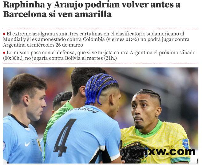 雷速体育3月18日讯 根据《世界体育报》的报道,若拉菲尼亚和阿劳霍在下一场国家队比赛中染黄,就可以提前回到巴萨,备战下一场和奥萨苏纳的比赛。