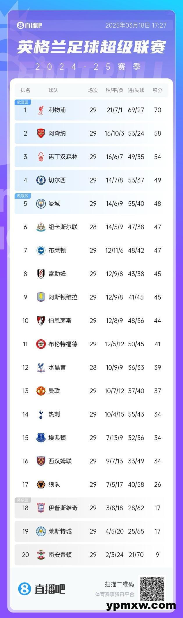 直播吧03月18日讯 英超基本锁定第五个欧冠名额,BBC指出,在极端情况下,英超本赛季第11名下赛季都有欧战可踢。