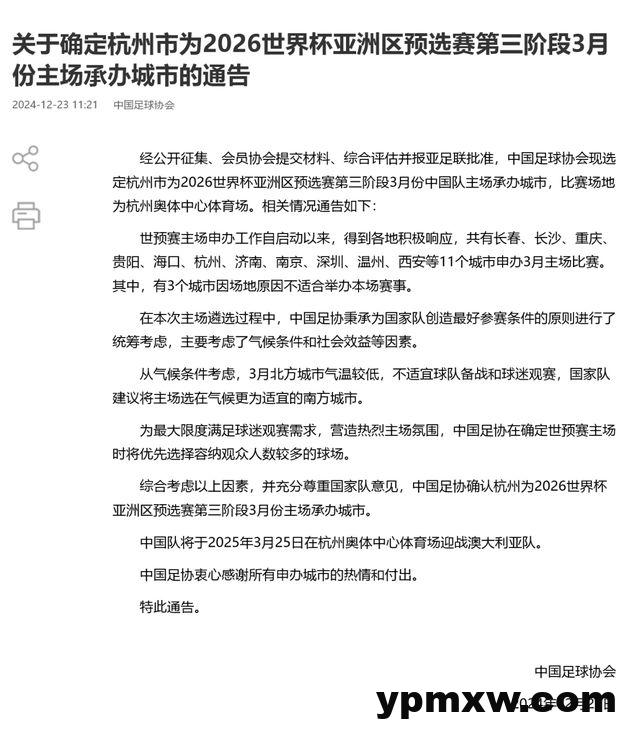 去年12月,中国足协官网发布公告,正式确认杭州为2026世界杯亚洲区预选赛第三阶段3月份主场承办城市。