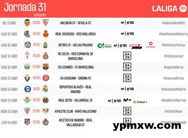 直播吧3月20日讯 西甲官方公布了第31轮比赛的开球时间,莱加内斯vs巴萨4月13日3点开球,阿拉维斯vs皇马4月13日22点15分开球。