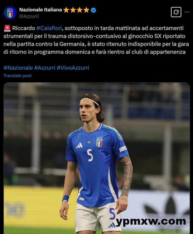 意大利队官方:卡拉菲奥里左膝扭伤+挫伤,将返回阿森纳