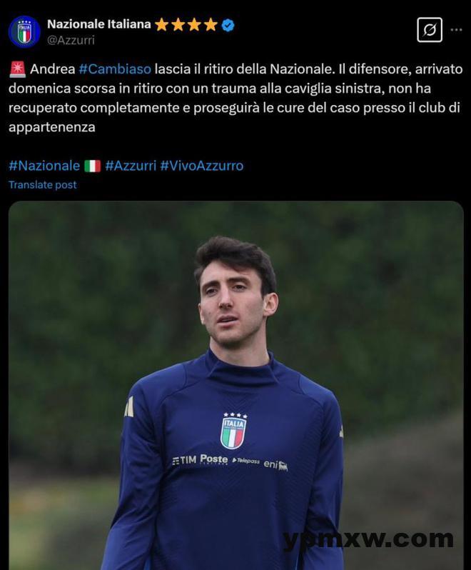 意大利队官方:坎比亚索因左脚踝伤势退出本期国家队,将返回尤文