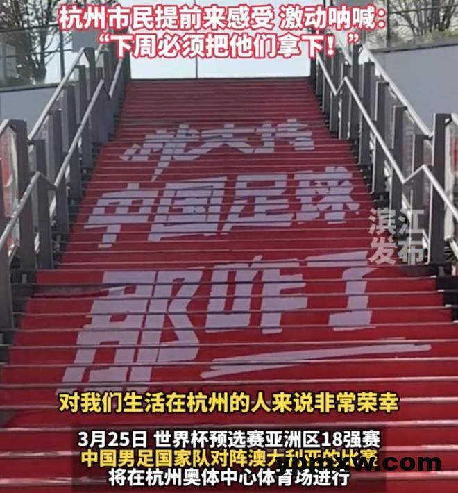 在现场的杭州市民揭先生表示:“国家队出征,对我们生活在杭州的人来说非常荣幸,横幅挂出来以后,现在已经非常激动了,内心有点澎湃了,下周我们必须把对手拿下。”