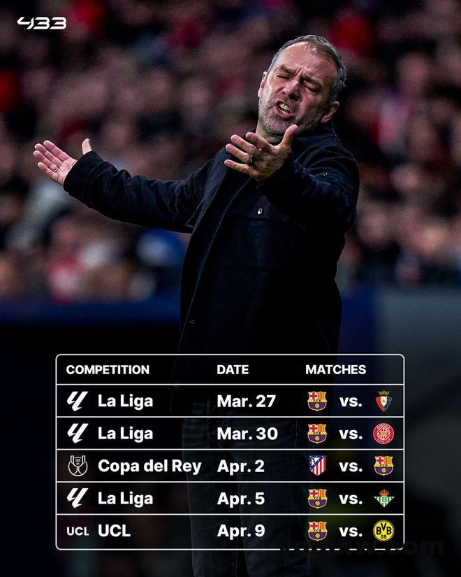 直播吧03月22日讯 西甲官方确认,巴萨对阵奥萨苏纳的第27轮补赛将于3月28日4点进行,在20天的时间内,巴萨要进行7场比赛,其中有4场比赛距离上一场结束休息时间不满72小时。