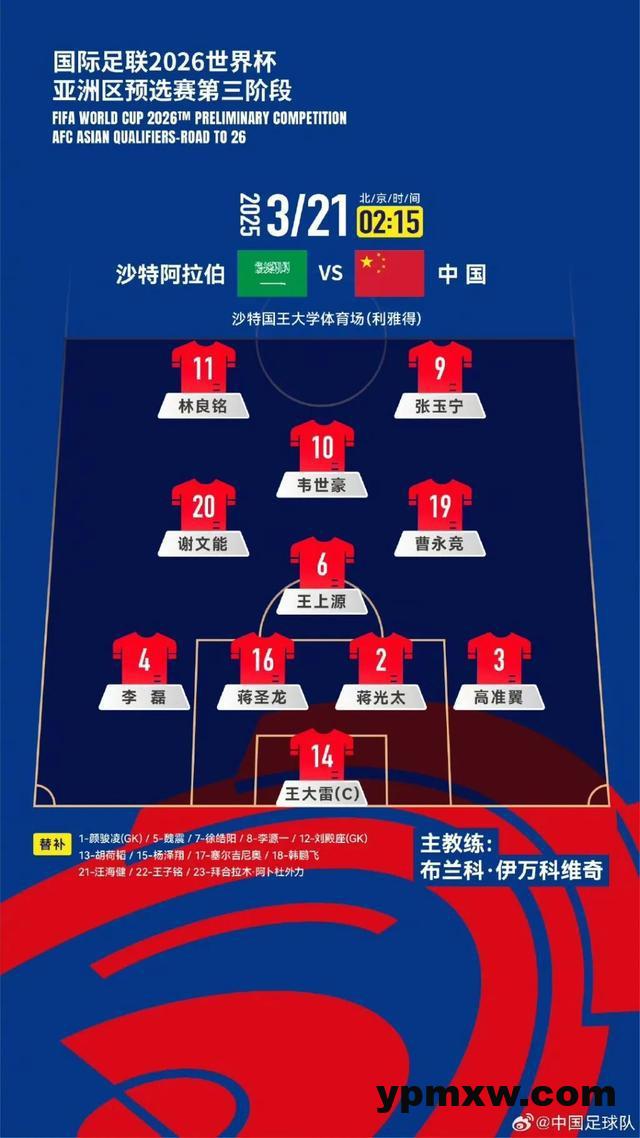 本场比赛,国足依然延续了常用的菱形中场体系,门将王大雷,四后卫高准翼、蒋圣龙、蒋光太、李磊,后腰王上源,身前谢文能和曹永竞分居两边,韦世豪打前腰,双前锋张玉宁搭档林良铭。刚刚完成归化的中场塞尔吉尼奥本场比赛打替补,两名U20小将王钰栋、刘诚宇未能进入23人比赛大名单。首发阵容身价估值,国足总共617.5万欧,而沙特高达2092万欧。根据最新一期的国际足联排名,沙特排名第59位,中国排名90位。国足上一场击败沙特还要追溯到2015年1月的亚洲杯小组赛第一场比赛,王大雷第62分钟扑点,于海第81分钟任意球折射破门,国足1比0战胜沙特。王大雷也是国足首发中唯一亲历这场比赛的球员。首发名单中,李磊、谢文能、王上源、张玉宁、林良铭、曹永竞、韦世豪七名球员身上都有黄牌,如果他们本场比赛吃到黄牌,就将累计两张黄牌停赛,错过3月25日世预赛对阵澳大利亚的比赛。赛前,沙特媒体盘点了伊万带队期间与沙特交锋的战绩。统计显示,在伊万执教阿曼和国足期间,共5次和沙特交手,成绩为1胜4负,仅有的1次胜利是在2023年海湾杯,他带领阿曼2比1击败沙特。