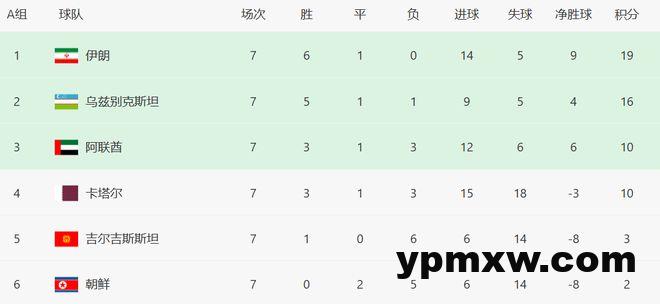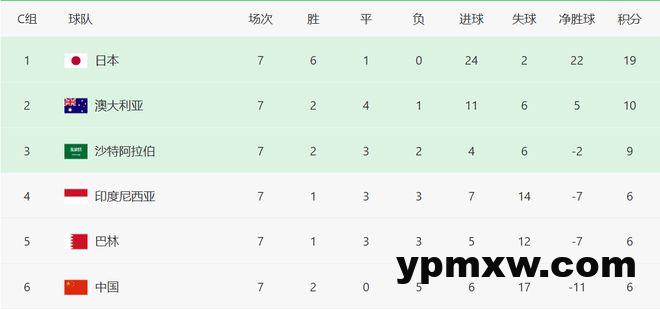 因为中国队客场0-7输给日本,所以中国队目前的净胜球达到负11个,所以排名小组最后。从目前的形势看,中国队想以小组第2出线,几乎就是理论上的可能,国足最大的希望,是与巴林和印尼争夺小组第4名。