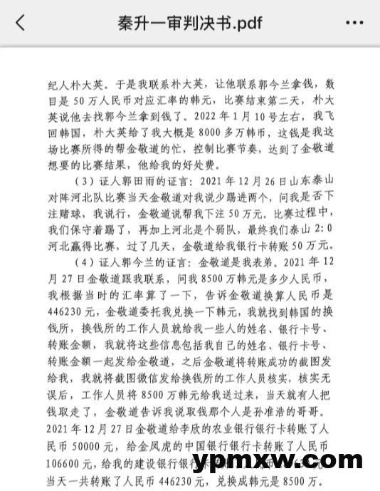 雷速体育3月23日讯 近日,网络上流传一份判决书,该文件详细记录了前泰山队员金敬道、孙准浩和郭田雨供认操纵比赛的证词。
