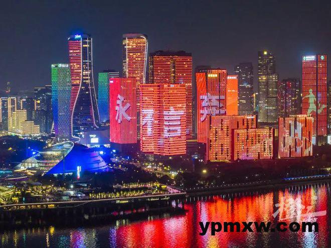 钱塘江畔大莲花已换上“中国红”新装;人流量最为密集的延安路龙翔桥,工联CC天幕循环播放着国足宣传片和赛事主题海报;钱江新城城市阳台天际线,璀璨光影邂逅绿茵豪情。