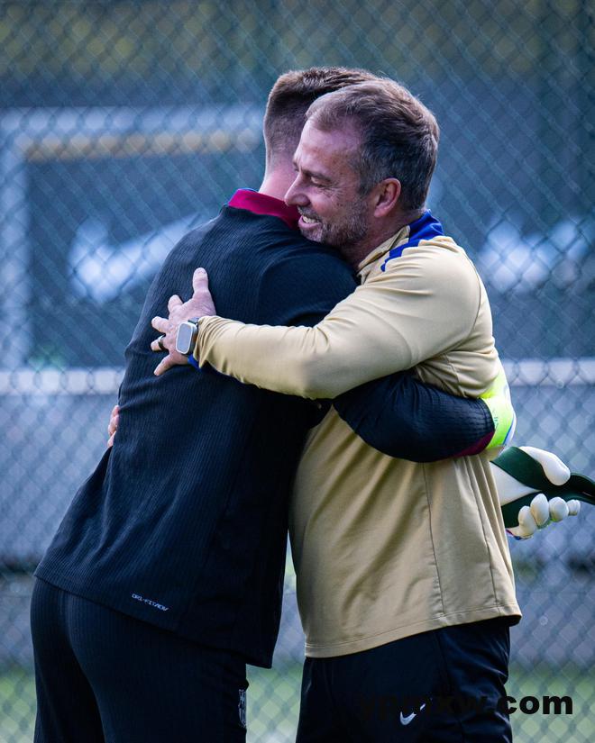 巴萨官方晒出了特尔施特根的最新训练照,以及他与主教练弗里克拥抱的照片。