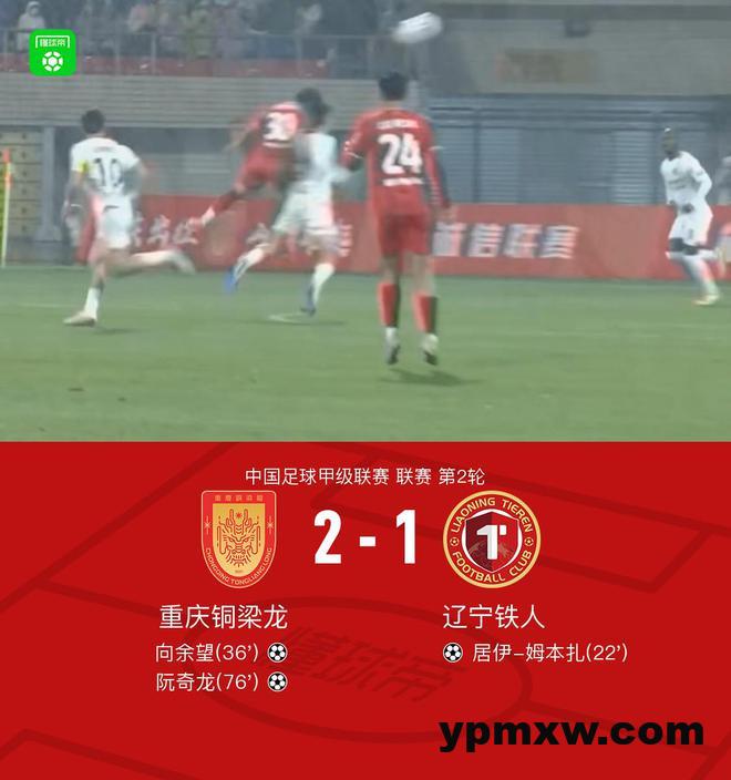 北京时间3月29日,中国足球甲级联赛第2轮,重庆铜梁龙主场迎战辽宁铁人。比赛中,辽宁铁人居伊-姆本扎率先打破场上僵局,为客队取得领先。随后,重庆铜梁龙展开反击,向余望打入一球扳平比分。之后,阮奇龙再下一城,帮助球队实现反超。最终,重庆铜梁龙以2-1战胜辽宁铁人。