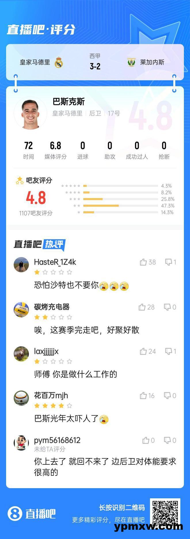 直播吧03月30日讯 皇马3-2战胜莱加内斯,首发右后卫巴斯克斯表现不佳。 推特上一则吐槽:看看巴斯克斯慢跑的样子,像是TM的训练课。求求了,这货色还能在皇马多踢一分钟都是对俱乐部的侮辱。 吧友评分: KY体育新闻中心 KY体育·(中国)官方网站新闻中心 普尔三分反超,篮网中锋德鲁·蒂米造成奇才干扰球完成准绝杀 上海男篮输给他,好像也没那么难接受
