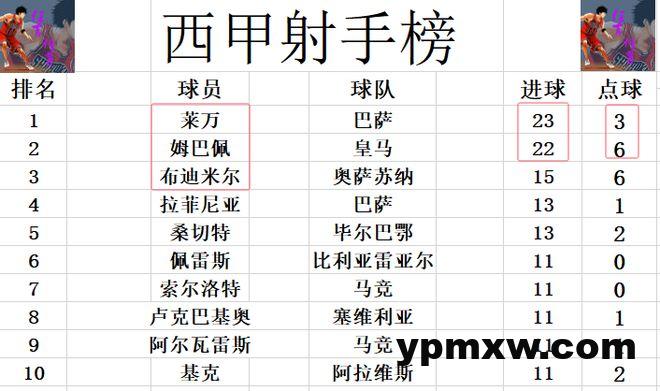 射手榜方面,姆巴佩梅开二度后再次将和莱万的差距缩小,在先赛的情况下只落后莱万1球,第3的布迪米尔已经落后姆巴佩7球,和冠军是巴萨和皇马竞争一样,金靴基本上也就在莱万和姆巴佩之间产生。索尔洛特,阿尔瓦雷斯和佩雷斯等人11球刚好挤入前十。