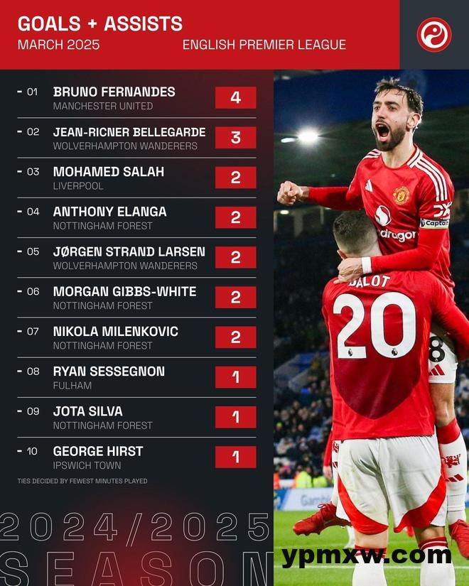 据统计,曼联队长布鲁诺-费尔南德斯是在3月的英超联赛当中直接参与进球数量最多的球员。