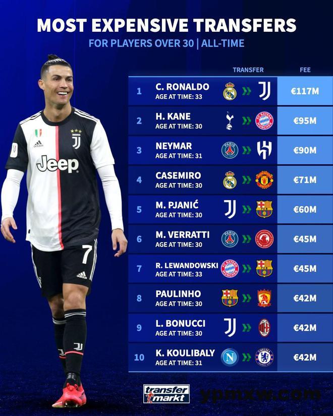 北京时间4月1日,德转统计出了世界足坛有史以来30岁以上球员转会身价最高的10笔交易,C罗高居第一,哈里-凯恩和内马尔分列第二和第三位。