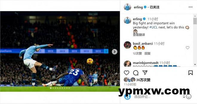 哈兰德在社交媒体上晒出自己比赛中射门的照片,配文:“昨天的大战和重要胜利!接下来是欧冠比赛,让我们加油。”