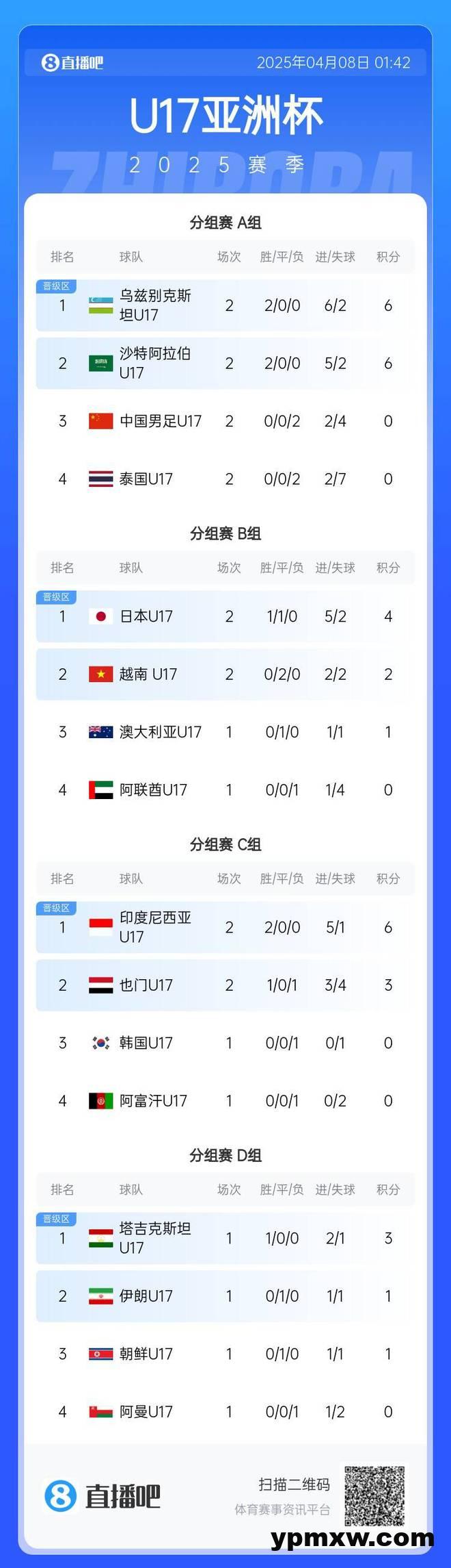 U17亚洲杯,印尼4-1战胜也门提前晋级世少赛,越南1-1战平日本同样有望晋级。