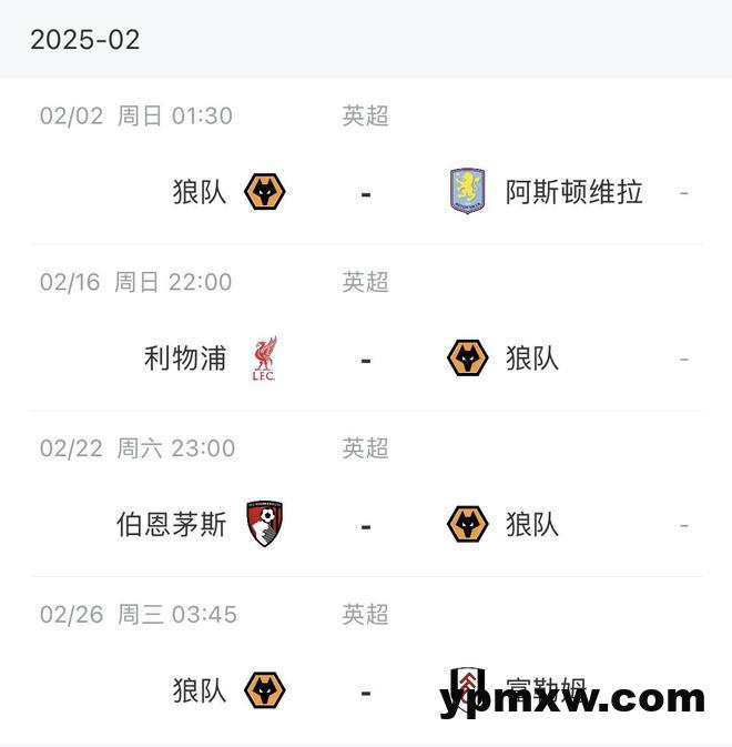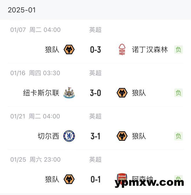 直播吧01月27日讯 佩雷拉上任后,狼队一度稍有起色,3场取得2胜1平之后,进入一月遭遇魔鬼赛程,重新掉入降级区。 1月份狼队魔鬼赛程,连遭森林、纽卡、切尔西、阿森纳,四场全负。↓ 2月狼队将迎来维拉、利物浦、势头正经的伯恩茅斯。↓ KY体育新闻中心 KY体育·(中国)官方网站新闻中心 阿贾克斯人团聚,利马、奥纳纳赛后和范德萨拥抱聊天 利桑德罗:科利尔是年轻一代的榜样 我们必须在获胜后保持谦逊