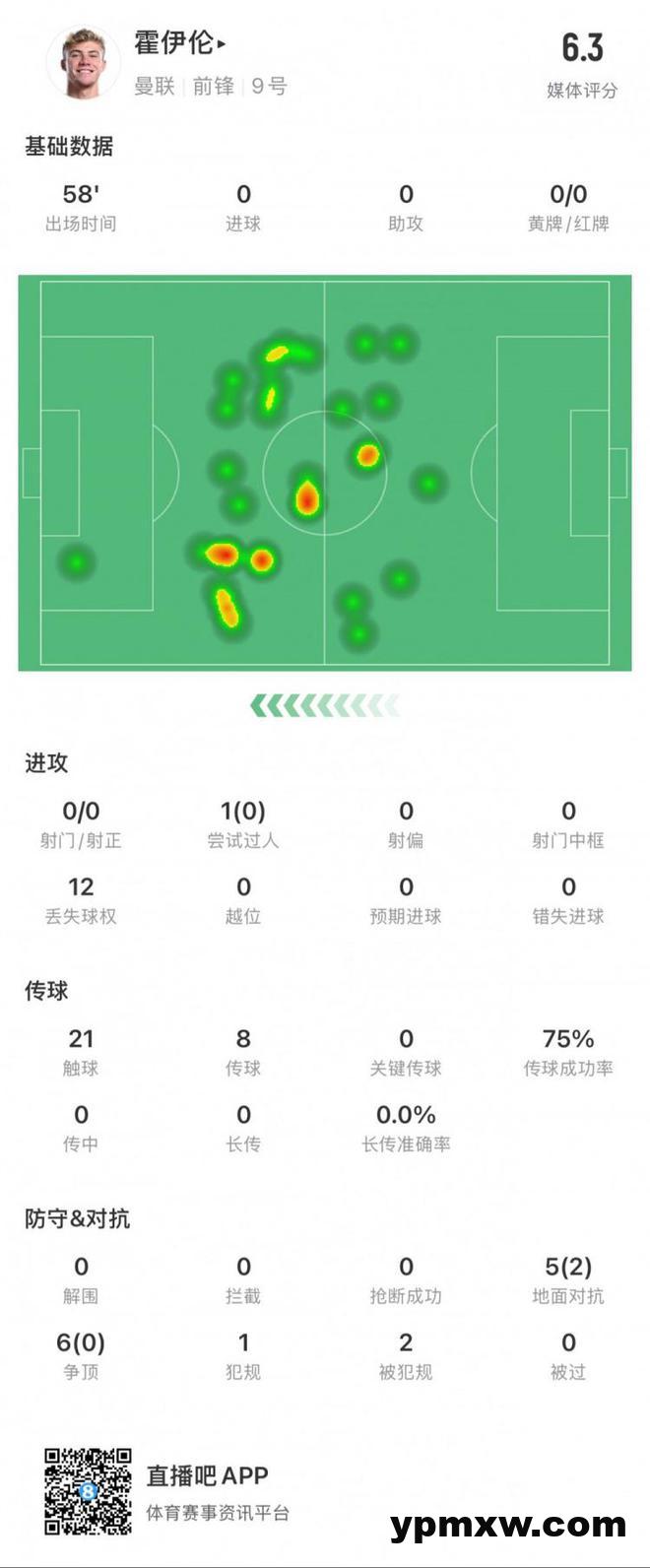 直播吧01月27日讯 本轮英超曼联1-0战胜富勒姆,本场曼联前锋霍伊伦首发出战58分钟,射门数为0,球员也遭遇各赛事11场球荒。
