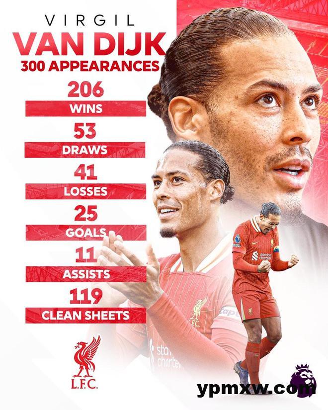 赛后,英超联赛官方社媒晒出了范戴克的数据海报,祝贺他达成了为利物浦出战300场这一里程碑。