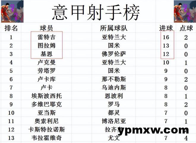 射手榜方面,雷特吉16球领跑,图拉姆13球排在第2,基恩则是12球位列第3。劳塔罗和卢卡库9球并列第5,亚当斯,奥索利尼,韦拉霍维奇和卡斯特拉诺斯7球刚好挤入前十。