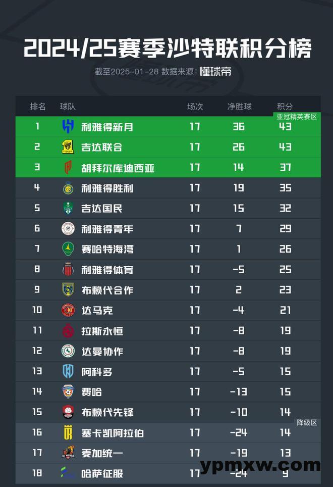 北京时间1月28日凌晨,沙特联赛结束了第17轮的全部争夺,这也意味着2024-25赛季的半程已过,积分榜也随之更新。