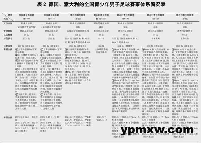 研究选取德国、意大利、英格兰、西班牙、法国、日本的全国(地区)青少年男子足球赛事体系进行案例分析。(表2-表5)